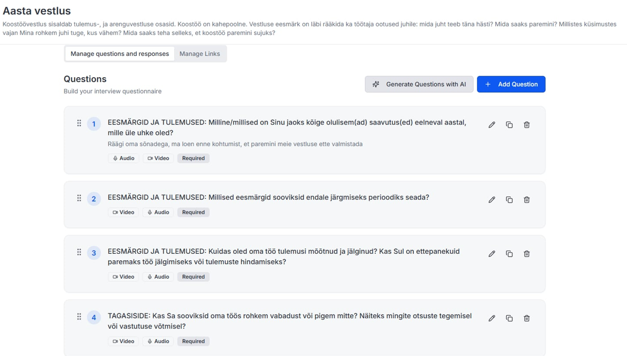 Loodud rakendusega said töötajad arenguvestluste küsimustele vastata omas tempos ja valida, et kas soovivad teha seda kirjutades, lindistades või videona. Seejärel analüüsis AI vastused ning tõi esile korduvad teemad ja võimalikud mustrid.