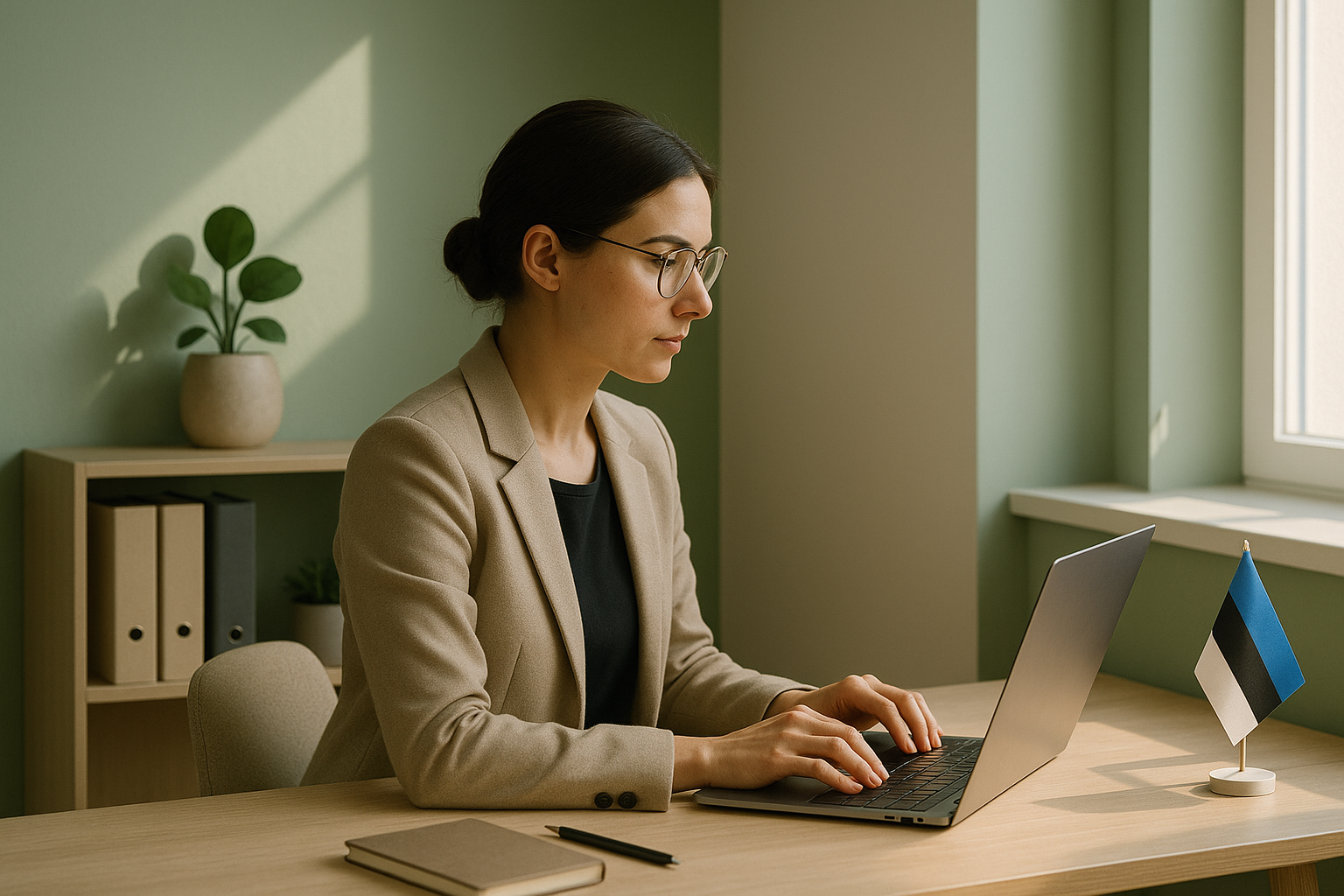 „Create a photo. Side view of a professional working at a clean desk in a modern, Nordic-style office. Sunlight from a large window casts soft shadows on the wall. Calm, focused atmosphere. Minimalist interior with muted green and beige tones, symbolising trust and stability. Estonian flag colors are subtly reflected in decor.“