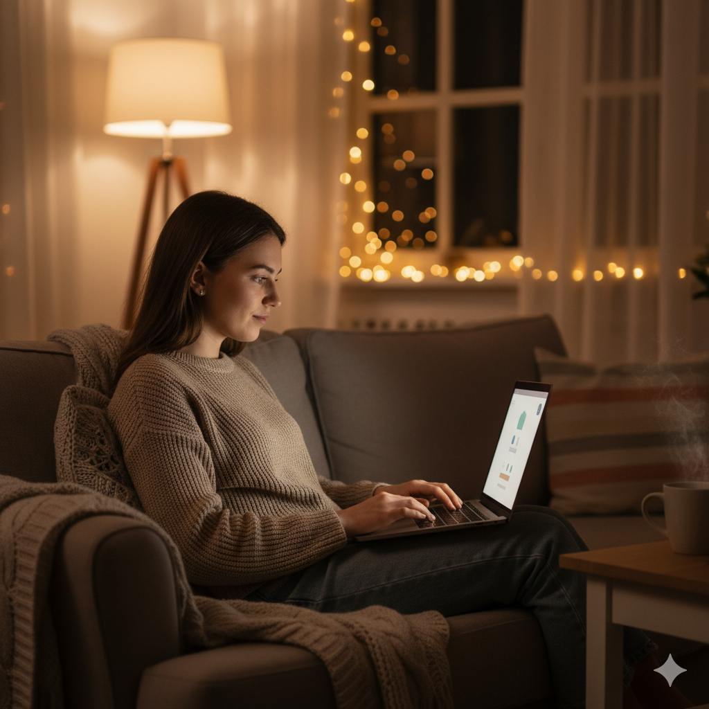 Medium shot of a person using a self-service portal on a laptop at home in the evening. Warm lighting, soft bokeh in background. Mood: simple, calm, trustworthy. The screen shows a blurred interface.