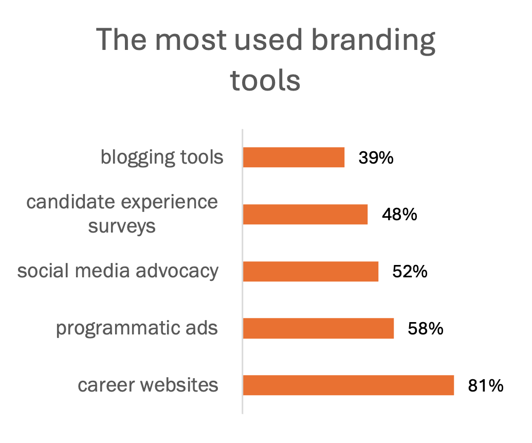 According to the latest Cliquify report, 71% of companies plan to maintain their 2024 budget levels, while 20% allocate over $500K annually to employer branding—additionally, 41% use two to three HR tech solutions to support branding efforts. The most used branding tools include career websites (81%), programmatic ads (58%), social media advocacy (52%), candidate experience surveys (48%), and blogging tools (39%).