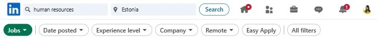 💡 Navigate to “Jobs” from the top menu on LinkedIn and you well have access to many job ads. Simply write a keyword in the search bar, select location and you are able to continue with several more filters that help you find the job offers that match your interests.
