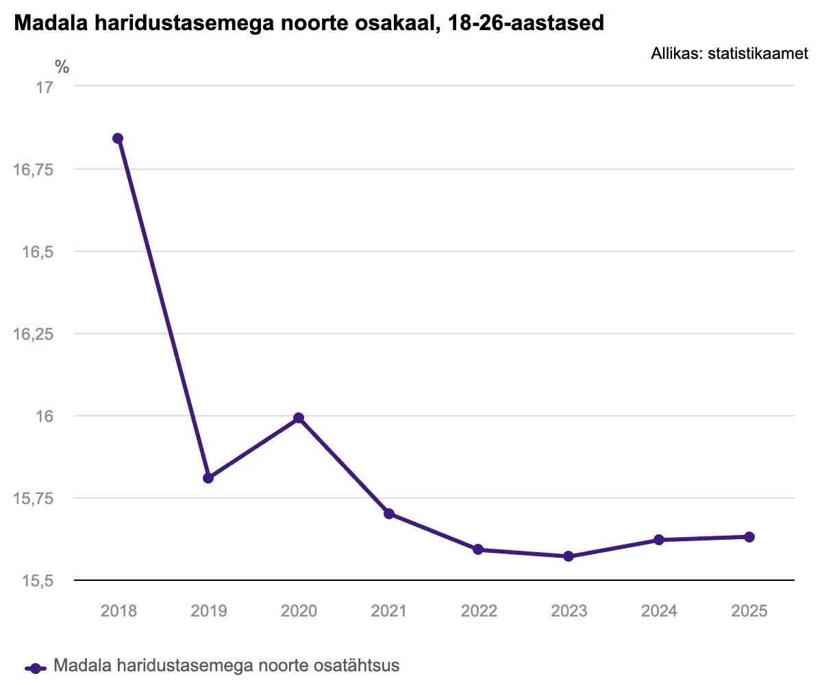 Statistikaameti värsked andmed näitavad, et madala haridustasemega noori on 7% võrra vähem kui kaheksa aastat tagasi. Viimasel neljal aastal on nende noorte osakaal püsinud peaaegu muutumatuna, jäädes ligikaudu 15,6% juurde. Madala haridustasemega noorte osakaal on suurem maalistes piirkondades, noorte meeste hulgas ja vene ning ukraina rahvusest noorte seas.