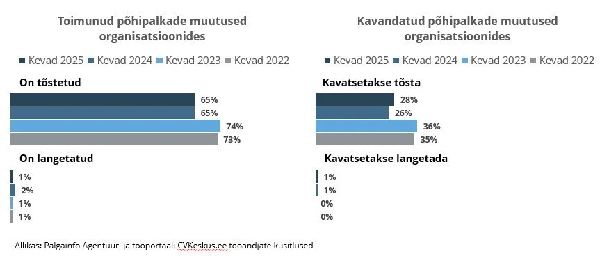 Palgatõusu plaanides on näha kerget elavnemist – veidi rohkem on neid, kes plaanivad palgatõusu, ja vähem neid, kes ei ole palku tõstnud ega kavanda seda teha või ei ole veel otsustanud. Selle aasta jooksul plaanib töötajate põhipalkasid tõsta veidi üle veerandi (28%) küsitluses osalenud organisatsioonidest. Sama paljud (28%) ei oska veel öelda, kas palgamuutused tulevad, 44% on aga kindlad, et palgamuutusi sel aastal enam ei tule. Vaid veidi üle kümnendiku (13%) küsitluses osalenud tööandjatest ei ole põhipalkasid muutnud ega kavatse seda ka teha.