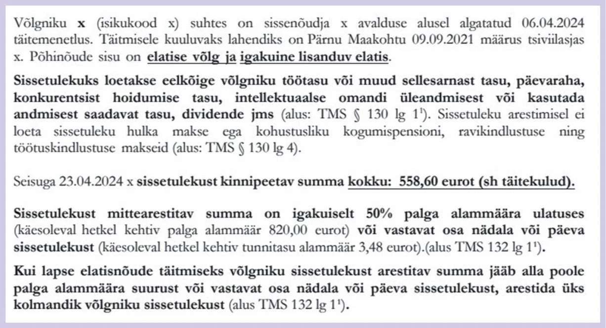 Siinkohal on oluline meeles pidada, et sissetuleku arestimisel ei loeta sissetuleku hulka riiklikke makse, kohustuslikku kogumispensioni ega ravi- ja töötuskindlustuse makseid. Lihtsustatult öeldes tähendab see seda, et arestimised tehakse alati töötaja netotasult.