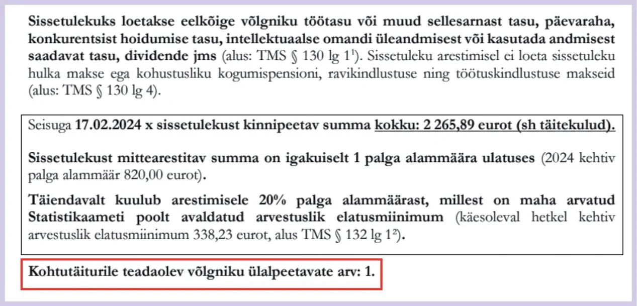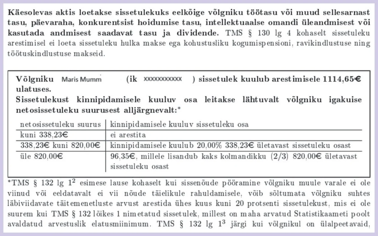Täitemenetluse seadustiku § 132 lg 1 kohaselt ei arestita sissetulekut, kui see ei ületa ühe kuu eest ettenähtud palga alammäära suurust või vastavat osa nädala või päeva sissetulekust. § 132 lg 3 järgi jäetakse töötajale lisaks töötasu alammäärale kätte veel ka üks kolmandik mittearestitavat summat ületavast sissetuleku osast.