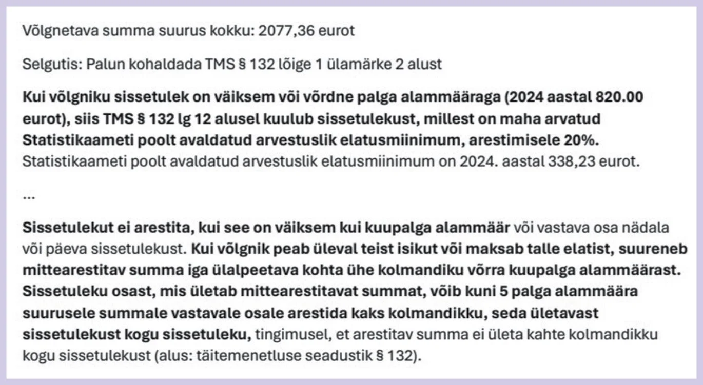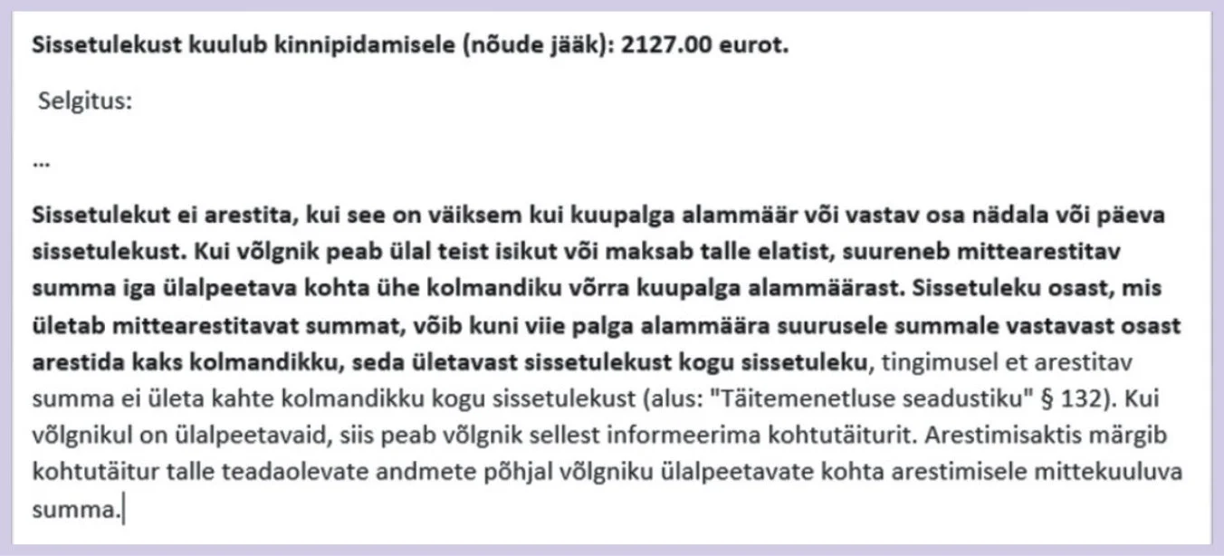 TMSi § 132 lg 12 ütleb, et kui sissenõude pööramine võlgniku muule varale ei ole viinud või eeldatavalt ei vii nõude täielikule rahuldamisele, võib sõltumata võlgniku suhtes läbiviidavate täitemenetluste arvust arestida ühes kuus kuni 20 protsenti sissetulekust, mis ei ole suurem kui käesoleva paragrahvi lõikes 1 nimetatud sissetulek, millest on maha arvatud statistikaameti avaldatud arvestuslik elatusmiinimum. Antud paragrahvi rakendatakse enamiku arestimise aktide puhul, kuid praktikas näeme üsna sageli sellest kahte erinevat tõlgendust. Kui osa kohtutäiturite puhul on aktis selgelt öeldud, et 20% arestimist rakendatakse vaid juhul, kui töötaja töötasu jääb alla töötasu alammäära (820 eurot), siis teiste puhul on välja toodud, et 20% töötasu alammäära ja elatusmiinimumi vahest peetakse kinni igal juhul. Ka siis, kui võlgniku sissetulek on suurem kui töötasu alammäär. Toon siinkohal näiteks mõlemad variandid.
